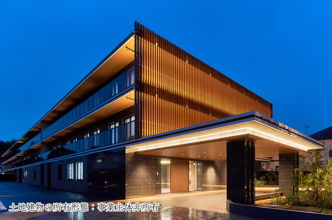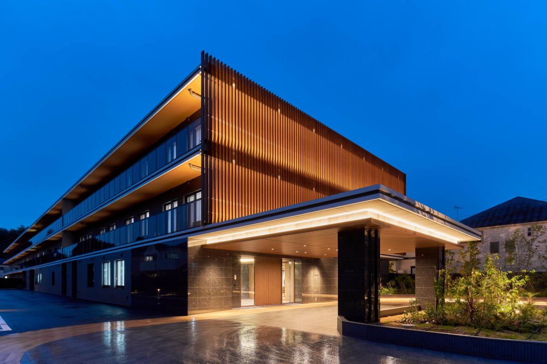建物前の通りから、アプローチ空間を利用した設計にこだわり、外観は木の質感を生かしたデザインに加え、照明演出を取り入れることで、昼はやさしく街に溶け込み、夜はあたたかな光で存在感を放ち、高級感と温かみを兼ね備えた美術館のような佇まいです。