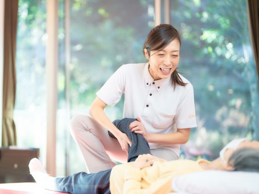 アズハイムでは、全事業所に専門資格を持つ機能訓練指導員を配置。ご入居者の状態に合わせた個別機能訓練や、日常生活を通じた「生活リハビリ」のメニューの考案、楽しみながら行う小集団リハビリの実施により、身体機能・生活機能の維持・向上を目指しています。